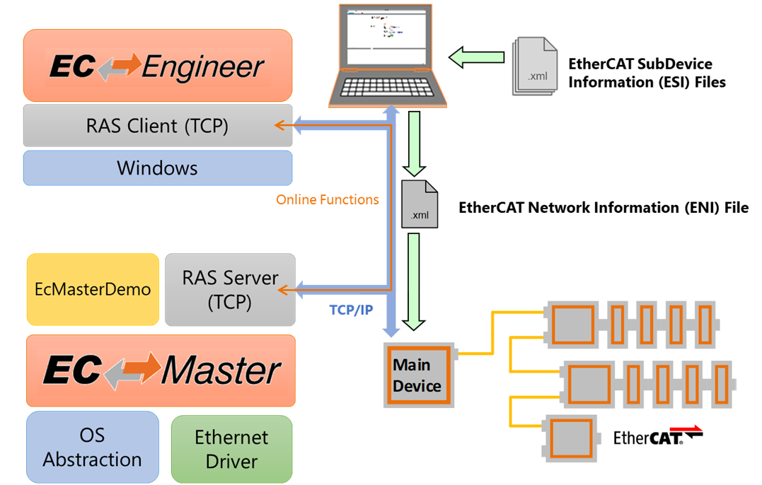 Before diving into error categories, it helps to understand how the diagnostic components fit together. The EC-Master stack runs alongside the real-time application and exposes a RAS server. EC-Engineer connects as a RAS client over TCP/IP — no project files are needed, just an IP address — and can display the full topology, states, process data, and error counters in real time.