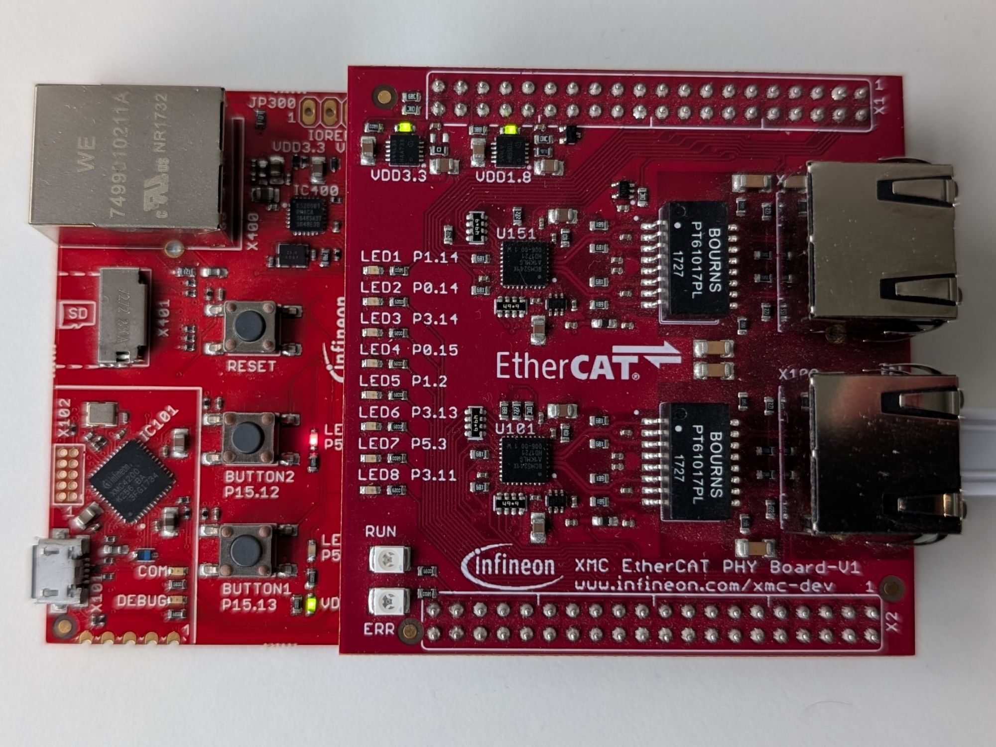Certain error conditions cannot be replicated at all—or only with great difficulty—using standard SubDevices. For this reason, acontis has developed special firmware for the Infineon XMC4800 Relax Kit to make it easy to trigger these errors. The corresponding function is selected using Button 1 and activated using Button 2.