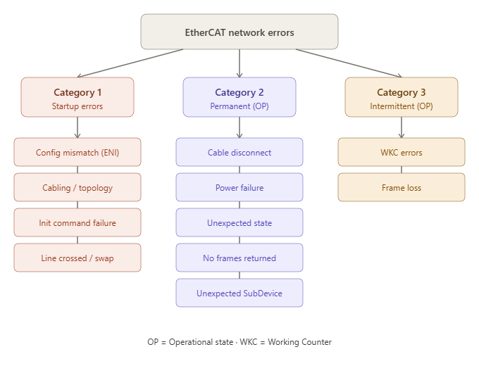 Every error an EtherCAT MainDevice encounters falls into one of three categories, depending on when it occurs and how persistent it is.