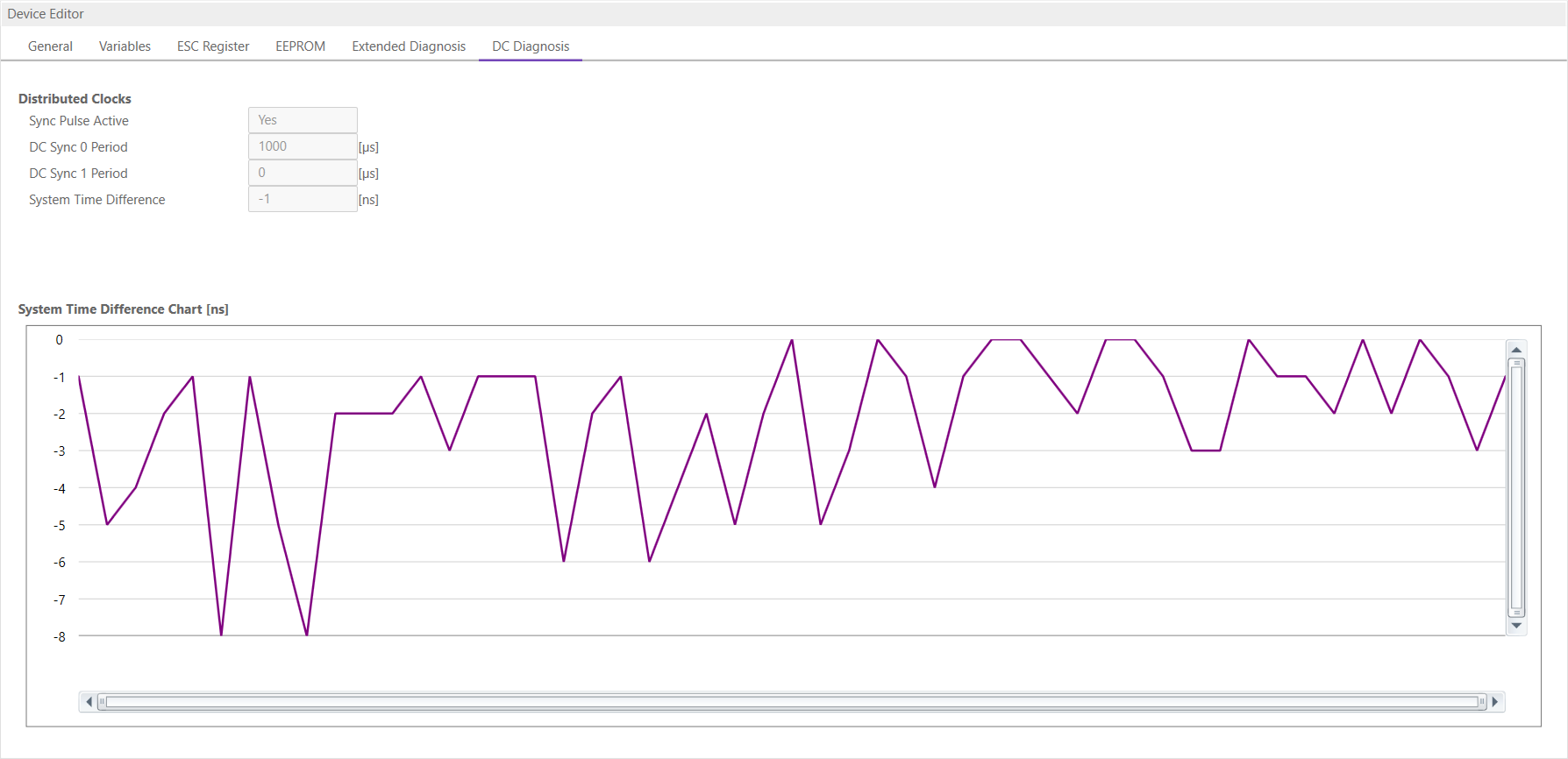 A new visualization on the DC Diagnosis Tab makes synchronization issues easier to spot. The graph displays the system time difference between the EtherCAT master and the distributed clocks of the connected slave, turning raw numbers into an intuitive curve.
