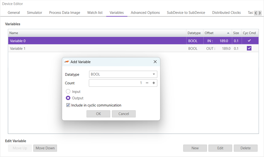 The existing feature "Trace Data" was improved in EC-Engineer V4.1. Earlier it was only possible to create output variables. These variables were always included in the cyclic commands. Now it is also possible to create input variables and decide which variables should be sent on the cable.