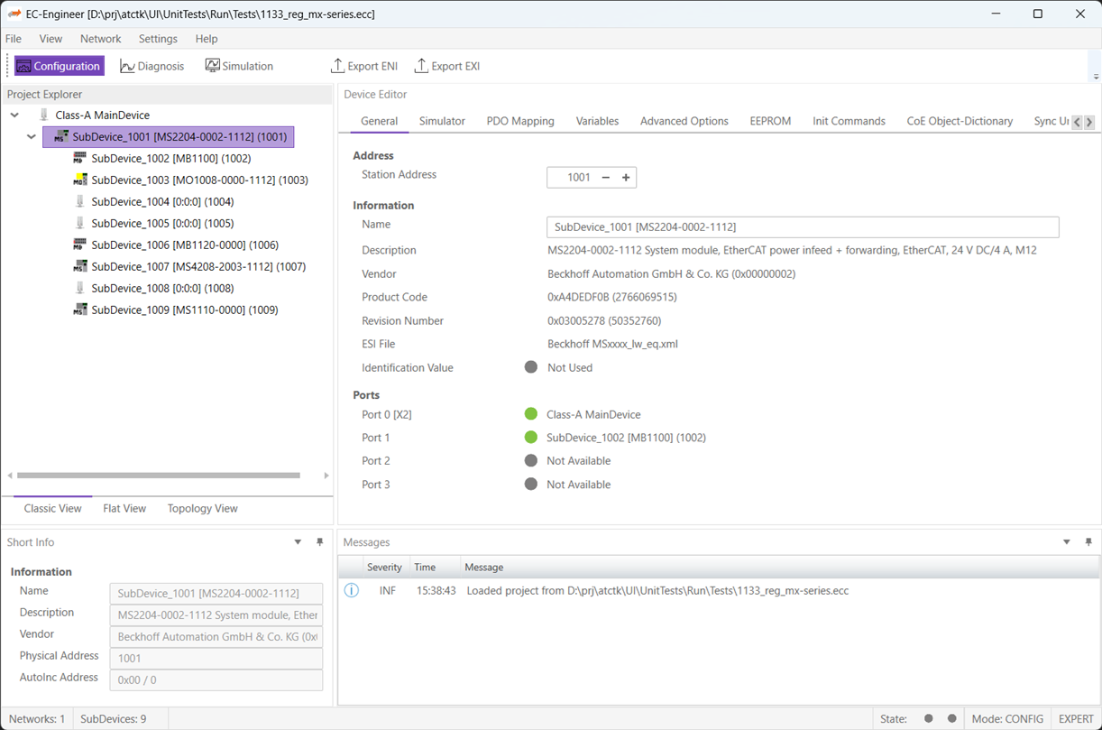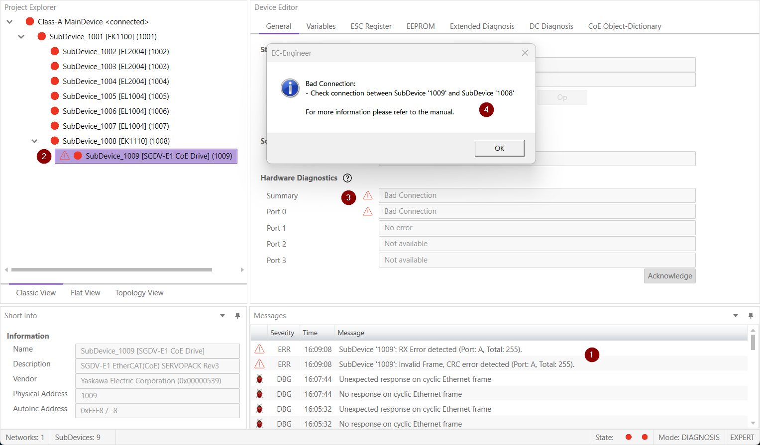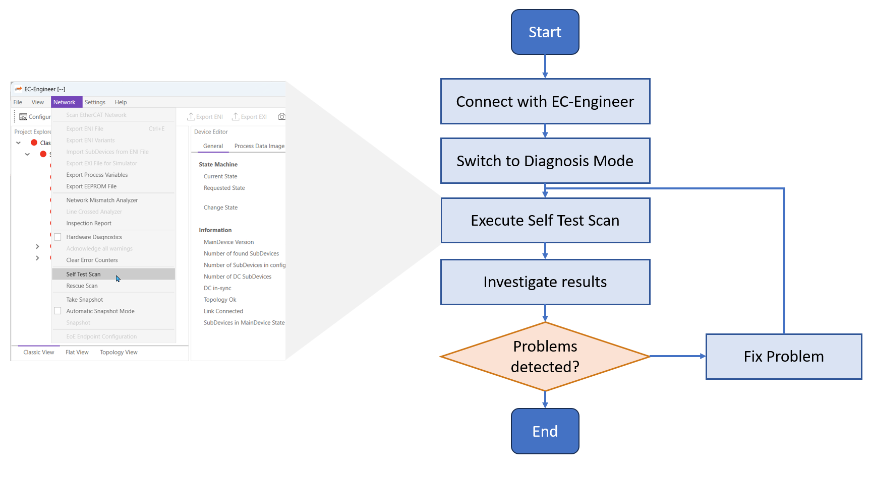 The Self‑Test Scan is one of the most important innovations in EC‑Engineer 4.1. It provides an automated check of your EtherCAT network. With the self-test scan, it is possible to detect communication errors in an EtherCAT network and locate the cause. A communication error manifests itself in that not all EtherCAT frames sent by the MainDevice are received again. The frames are lost on their way through the EtherCAT network or are marked as corrupt by the error detection in the EtherCAT subdevices. The Ethernet controller in the main device also checks the correctness of the frame upon receipt using CRC calculation. If the check fails, the frame is discarded.