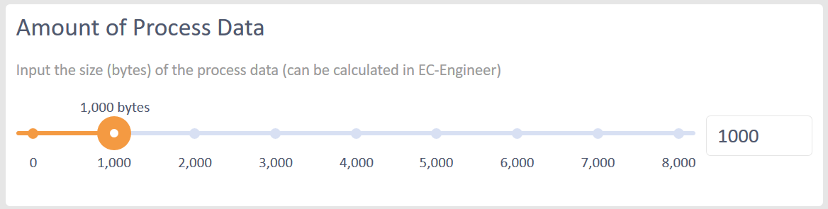 Perhaps the most important parameter is the amount of process data, typically because it is the parameter that will most affect the overall communication time. It is important to note that you are not limited to the size of a maximum Ethernet packet (~1,500 bytes) for your EtherCAT process data. However, if you exceed this limit there will be multiple cyclic frames sent which will add some bytes of overhead. This calculator takes that into account.