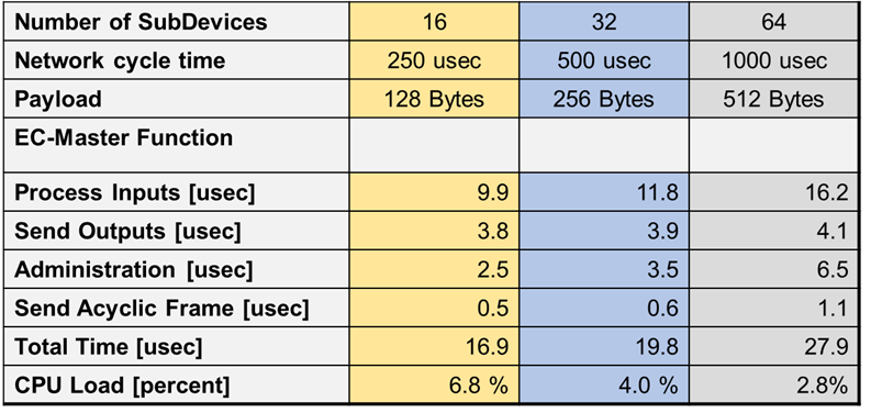 The following measurement results were performed with 16, 32, and 64 SubDevices on different controllers with different cycle times. The percentage load on the CPU by the EC-Master is calculated by taking the ratio of the cumulative runtimes of the job functions and the overall cycle time.