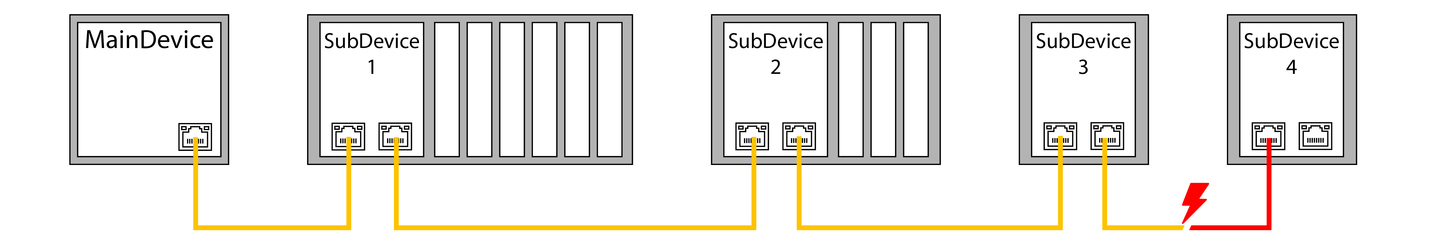 The EtherCAT SubDevice Controller in each node checks the moving frame for errors with a checksum. Information is provided to the SubDevice application only if the frame has been received correctly. If there is a bit error, the error counter is incremented and the subsequent nodes are informed that the frame contains an error. The MainDevice will also detect that the frame is faulty and discard its information. The MainDevice can detect where the fault originally occurred in the system by analyzing the nodes’ error counters.