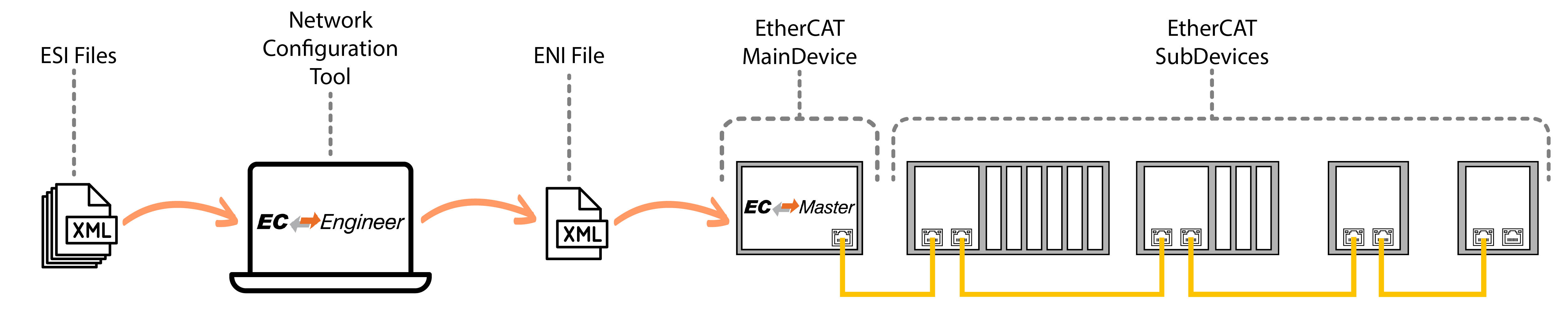 The system architecture of an EtherCAT implementation can be broken down into three main components: configuration files, the EtherCAT MainDevice, and the EtherCAT SubDevices. EtherCAT configuration files are used by the MainDevice to configure and initialize an EtherCAT network. The configuration files contain detailed information about the SubDevice configuration and network topology. The MainDevice, also known as the EtherCAT MainDevice, is responsible for managing the EtherCAT network, exchanging data with the SubDevices, and interfacing with outside applications. The SubDevices, known as the EtherCAT SubDevices, are typically sensors, drives, actuators, and simple digital/analog I/O, that perform specific tasks in the automation system.