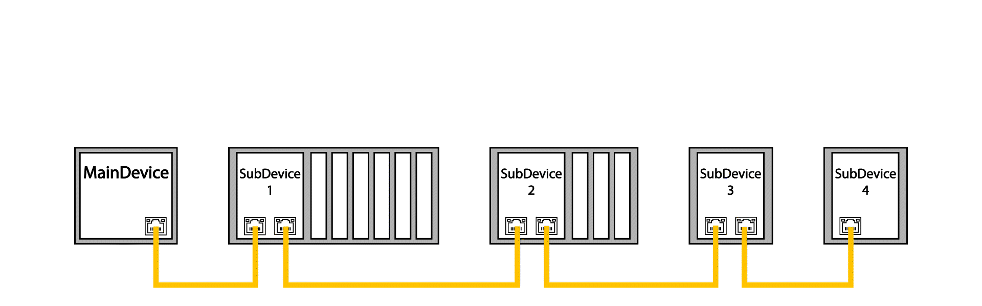 EtherCAT SubDevices communicate with the MainDevice by reading data from and writing data into the EtherCAT frames sent from the MainDevice as they move through the network, and they are also able to communicate with other SubDevices on the network via SubDevice-to-SubDevice communication. Each SubDevice is automatically assigned a unique identification number called an "address", and the MainDevice uses this address to communicate with the SubDevice. The functionality of a SubDevice is defined by the SubDevice's ESI file which is typically provided by the SubDevice’s manufacturer. The ESC allows various topologies and enables cable and MainDevice redundancy.